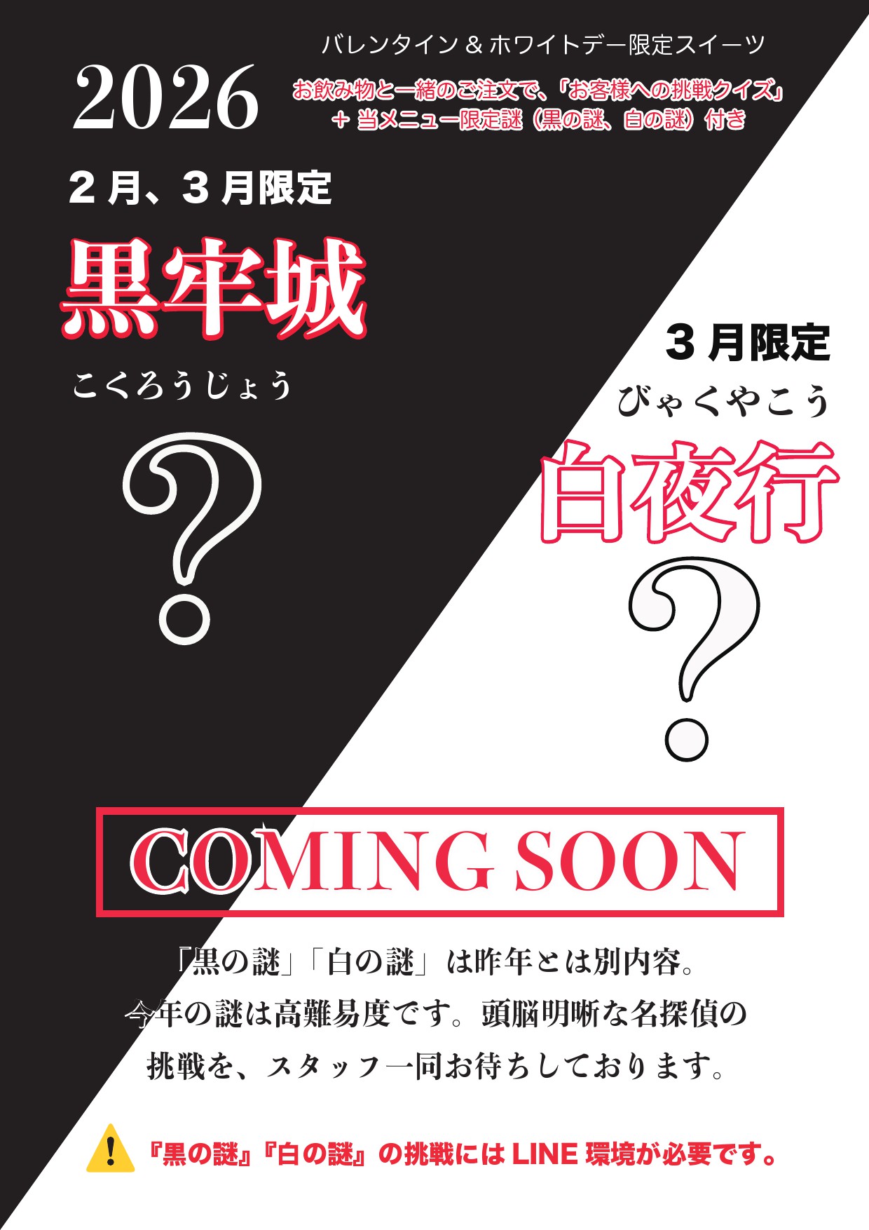 お飲み物と一緒のご注文で『黒牢城』には【黒の謎】、『白夜行』には【白の謎】をお付けいたします。