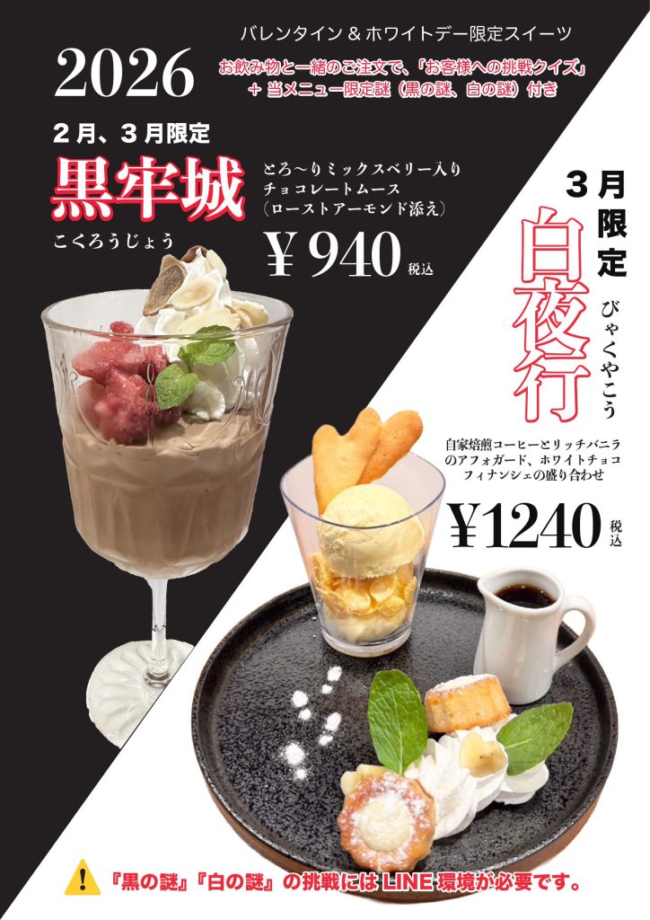 バレンタイン&ホワイトデー期間恒例! 2月、3月限定スイーツ『黒牢城』と、3月限定スイーツ『白夜行』を今年も全店舗で発売します(黒牢城2/1、白夜行3/1発売)。